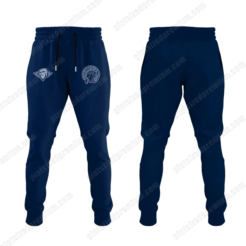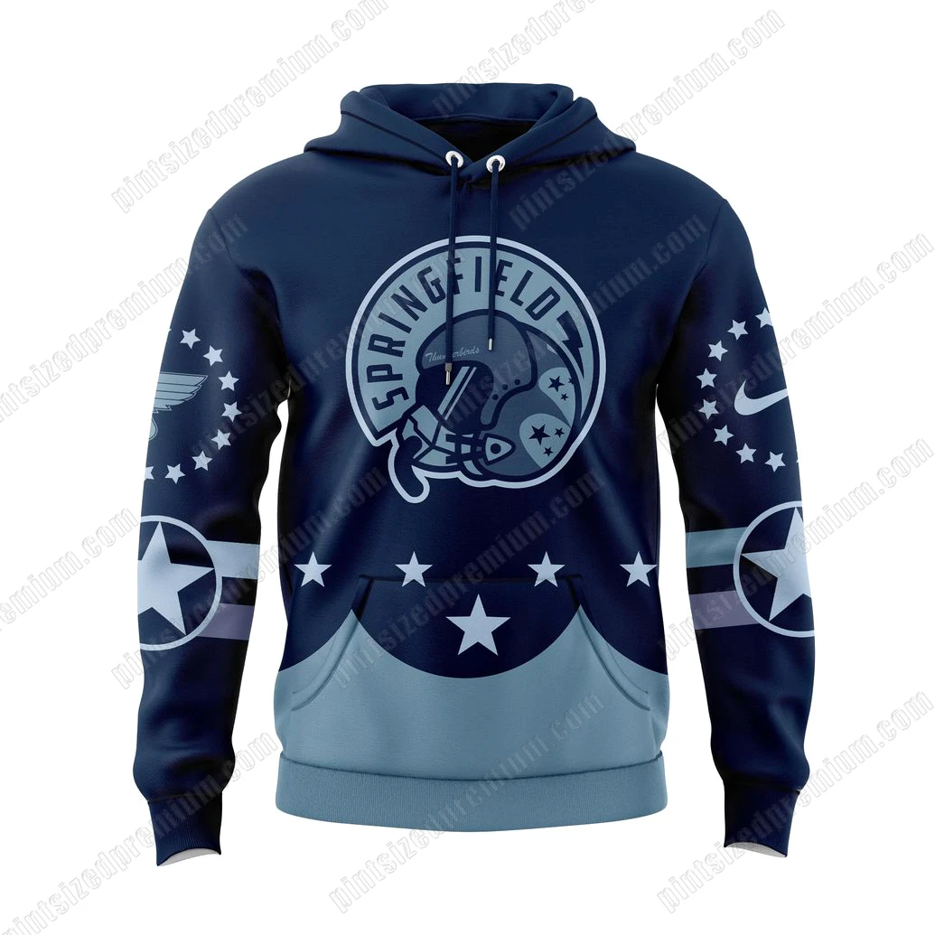 Every stitch and design element of this exclusive hoodie speaks to a legacy of quality and a profound narrative. Crafted from a premium, soft-touch fabric, this piece ensures superior comfort and enduring wear, making it perfect for those chilly nights at the stadium or casual outings. The deep navy base provides a classic, versatile backdrop for the intricate design work. On the front, a prominent circular emblem proudly displays “Springfield” encircling a detailed hockey helmet, adorned with subtle stars that evoke a sense of national pride and unity. The sleeves are a canvas of thoughtful tribute, featuring an elegant pattern of white stars interspersed with a distinctive roundel-style insignia, reminiscent of historical military markings, blending seamlessly with the team’s aesthetic. A stylized wing emblem graces the left sleeve, symbolizing flight and aspiration, while the right sleeve cuff bears a subtle, athletic brand mark, adding a touch of contemporary flair. The back of the hoodie showcases a bold, stylized eagle head emblem, the unmistakable symbol of the Thunderbirds, rendered in crisp white against the deep navy, commanding attention and embodying strength. Below, a striking light blue wave pattern elegantly divides the lower portion, suggesting fluidity and motion, a design motif that continues around the spacious kangaroo pocket on the front. Every detail, from the contrasting white drawstrings to the precision of the print, underscores PintSizedPremium’s commitment to unparalleled craftsmanship and a design that truly honors its dual inspiration.