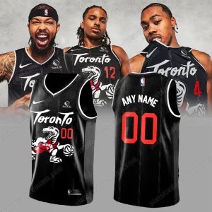 PintSizedPremium is synonymous with unparalleled craftsmanship, and the Toronto Raptors 2025/26 City Edition Jersey stands as a beacon of our commitment to quality. Every element of this design has been thoughtfully integrated, drawing directly from the bold aesthetic presented. The dominant black hue of the jersey projects an aura of sophistication and urban resilience, a perfect canvas for the iconic details that truly bring it to life. Across the chest, the word “Toronto” is emblazoned in a striking white script, its dynamic typography hinting at the city’s vibrant energy and ceaseless motion. Beneath this, the beloved classic Raptors “Dino” logo takes center stage, rendered in its iconic red shorts, white outline, and holding a pristine white basketball, capturing the playful ferocity that has defined the team for decades. This emblem is not just a graphic; it’s a piece of history, instantly recognizable and deeply cherished by fans. The jersey’s premium construction is evident in the crisp white trim that elegantly frames the V-neck collar and armholes, offering a sharp contrast that elevates the overall design. Furthermore, a subtle yet distinctive vertical striped pattern is woven into the fabric, adding textural depth and a touch of refined artistry that speaks to PintSizedPremium’s dedication to detail. On the reverse, the possibility for personalization shines through with the “ANY NAME” option displayed above a bold, red “00,” allowing fans to imprint their own identity onto this future classic, or to honor the spirit of the game itself. The inclusion of a premium sportswear emblem and a prominent partner insignia, along with the league’s official mark, further authenticate this limited edition piece, ensuring it aligns with the highest standards of athletic fashion and fan engagement.