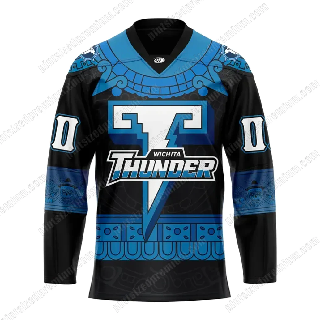 At PintSizedPremium, craftsmanship is our creed, and the Wichita Thunder x Day of the Dead 2025 Limited Hockey Jersey exemplifies our dedication to unparalleled quality and intricate design. Observe the striking visual narrative crafted directly from the imagery: a sophisticated black base provides a dramatic canvas for the vibrant, ethereal blue accents that command attention. The collar, shoulders, and a distinctive band across the chest and waist are adorned with meticulously rendered Day of the Dead inspired patterns. These designs are a rich tapestry of geometric shapes, stylized motifs, and subtle skull iconography (calaveras), all infused with an unmistakable Aztec and Mesoamerican artistic influence, celebrating a profound cultural heritage. The front proudly features the bold “T” for Thunder logo, underscored by “Wichita Thunder,” presented with a dynamic, lightning-bolt aesthetic that embodies the team’s fierce spirit. Every line, every curve of these intricate patterns is printed with a precision that speaks volumes of our commitment to detail, ensuring the artwork maintains its sharp definition and vivid color saturation wear after wear. The sleeves continue the black base, beautifully offset by more of the intricate blue patterns on the upper arms, complete with crisp white numbers “00” on the forearms, enhancing its authentic hockey jersey appeal. On the reverse, the possibility of personalizing with “YOUR NAME” and prominent “00” numbers in white offers a unique touch, allowing fans to truly make this collectible their own. This thoughtful fusion of athletic functionality and artistic expression creates a piece that is as robust on game day as it is captivating for display.